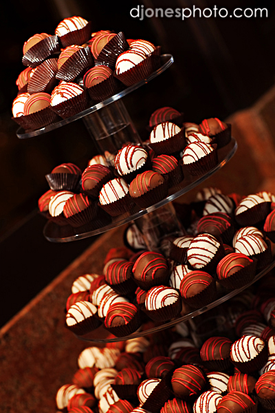 Angie’s Cake recently had the pleasure of being a small part of the Martin-Manteris wedding! 200 decorated Chocolate and Strawberry Cake Balls towered next to the Brides cake to create a Tower of Balls Grooms Cake!